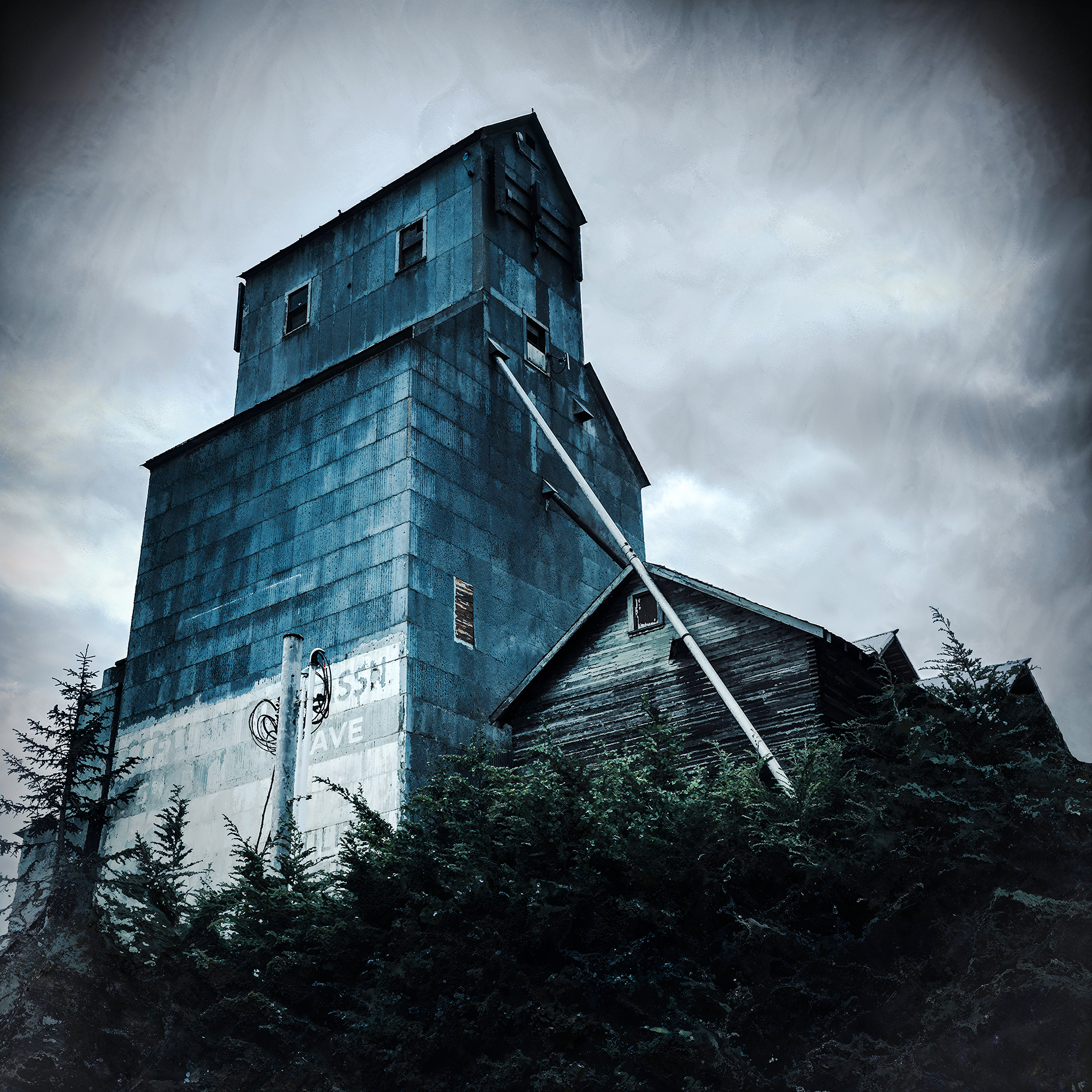 This photograph captures a striking, haunting image of an abandoned grain elevator, standing tall against a dramatic, overcast sky. The structure is clad in weathered blue-gray metal sheets, giving it an imposing, yet melancholic presence. The main building is a towering rectangular form, flanked by an adjoining wooden structure that appears equally neglected.