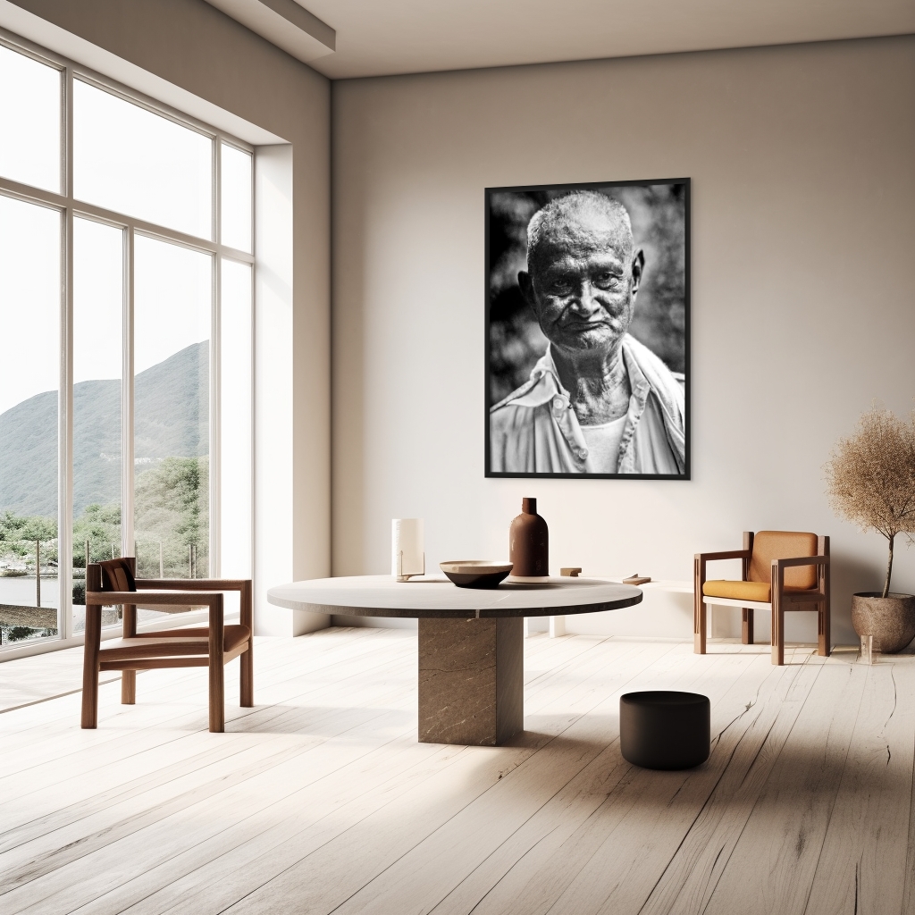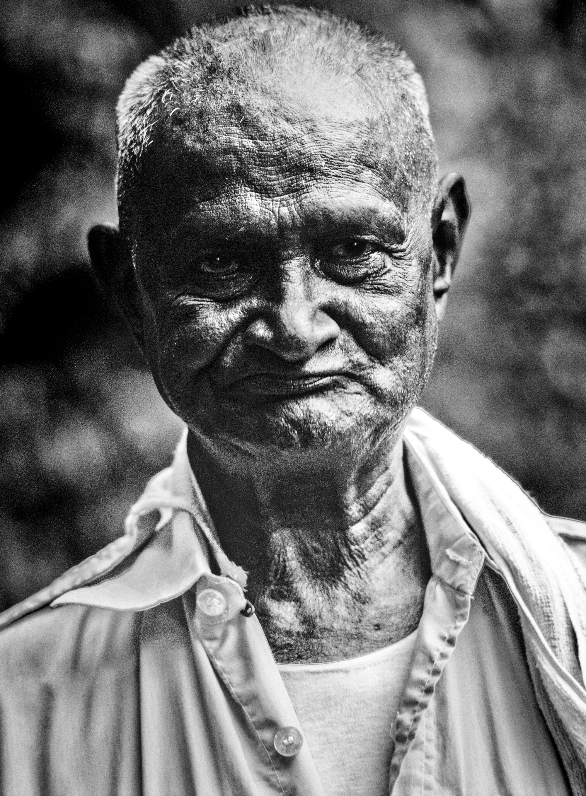 This striking black and white portrait captures the essence of resilience etched into the face of an elderly man. The detailed depiction showcases the intricate lines and textures of his weathered skin, suggesting a life rich with experiences and stories untold. His short, silver hair frames a face marked by deep-set eyes, which gaze directly at the viewer with a mix of wisdom and quiet fortitude. The subtle curve of his lips and the strong jawline reveal a personality shaped by time and endurance.