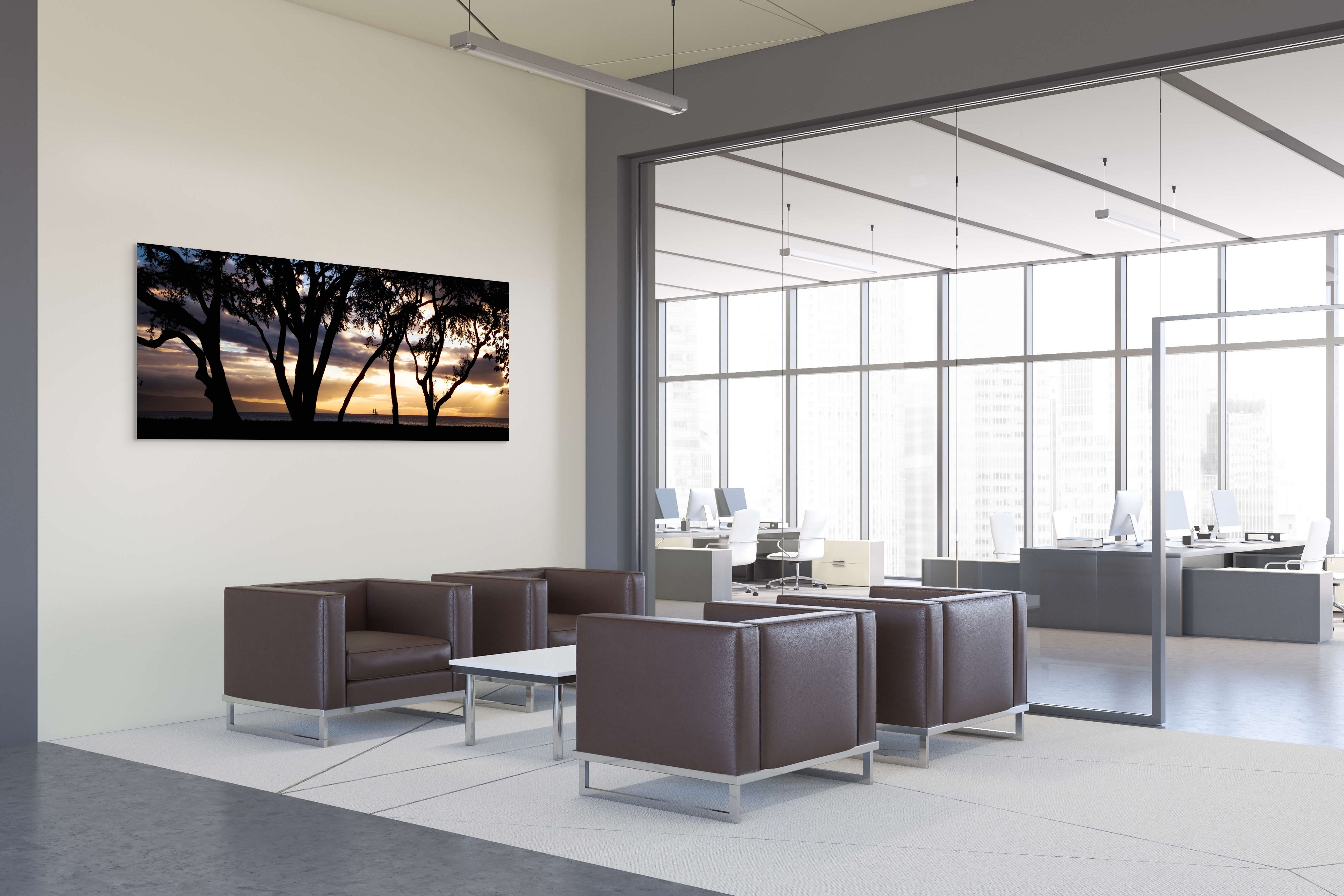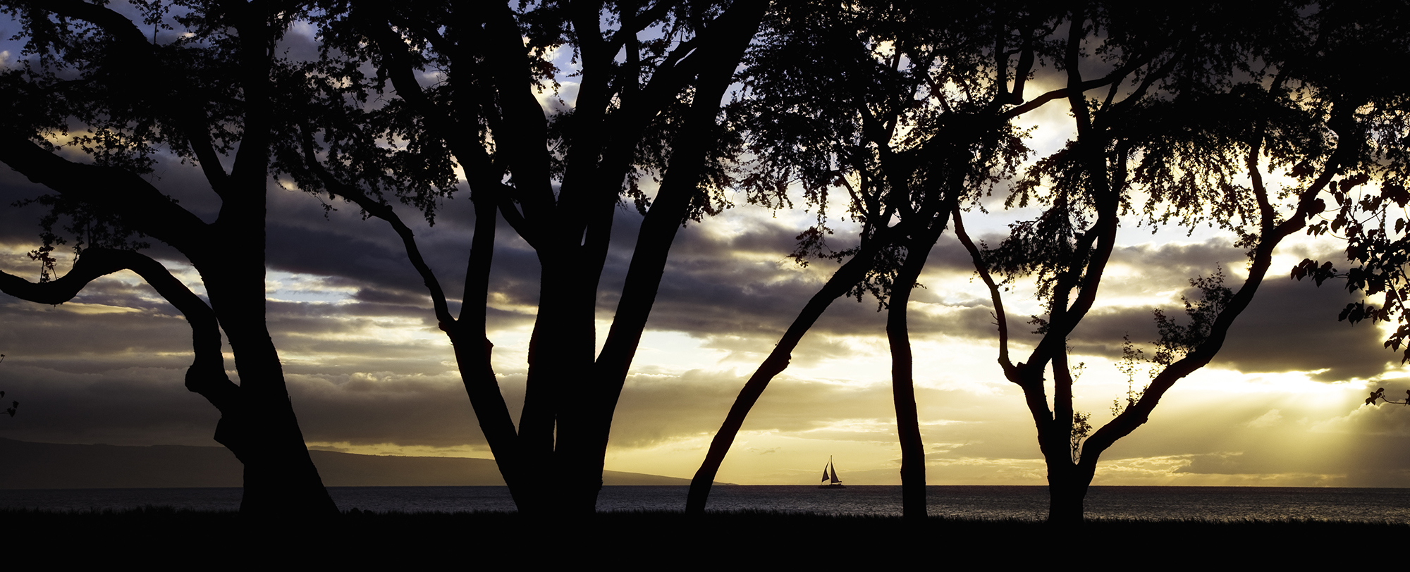 This captivating landscape photograph entitled "Sail Away" captures the tranquil beauty of nature at dusk. Dominating the foreground is a cluster of silhouetted trees, their branches and leaves intricately framing the sky. The horizon showcases a gentle transition of colors, from warm golds and oranges to subtle purples and blues, as the sun sets beyond the horizon.