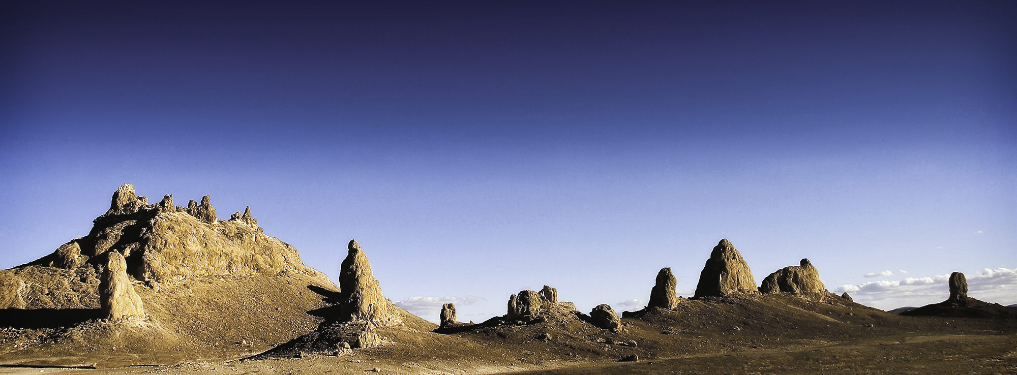 The image is bathed in the warm glow of a setting sun, highlighting the textured surfaces of the pinnacles. The foreground presents a rugged terrain, bordered by a backdrop of an expansive azure sky, which transitions seamlessly from a deep blue at the top to a softer hue near the horizon. This creates an atmospheric depth and sense of scale, emphasizing the isolation and majesty of the landscape.