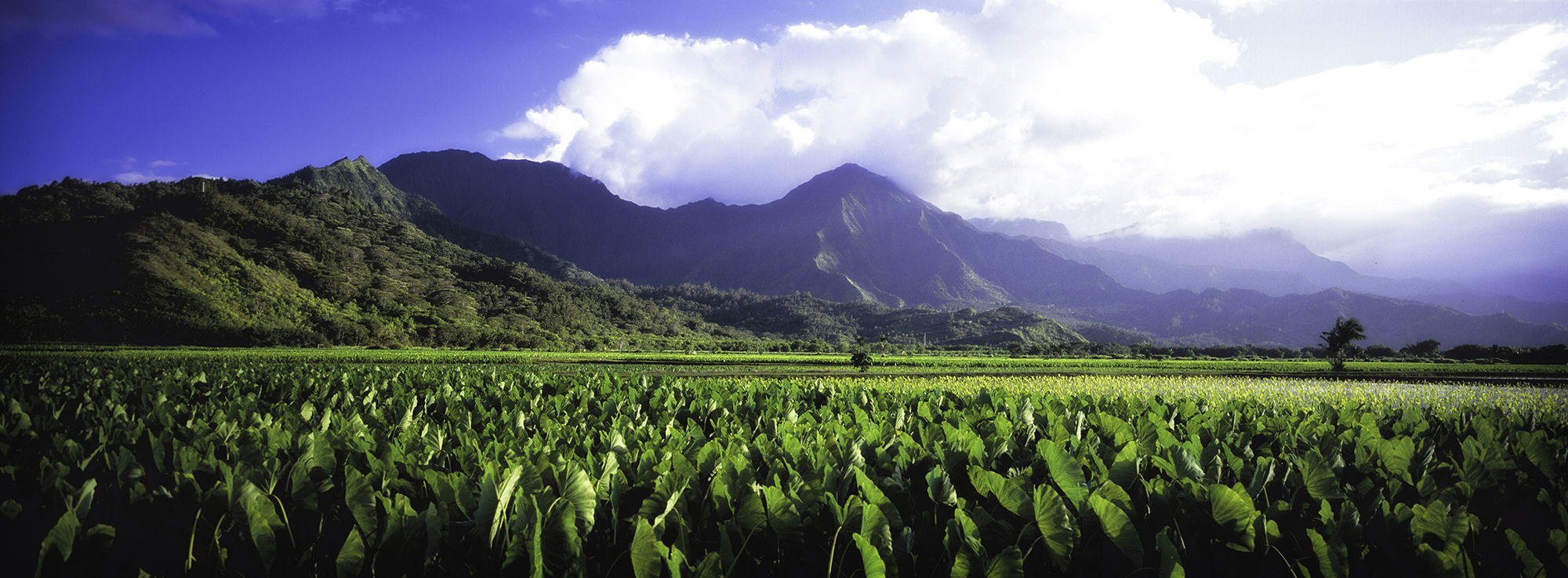 This landscape image presents a lush expanse of vibrant green taro fields stretching towards a dramatic mountain range in the background. The scene is set beneath a vast expanse of azure sky, punctuated by billowing white clouds that crown the rugged mountain peaks. The interplay of light and shadow on the mountains creates a dynamic sense of depth and texture, enhancing the visual impact of the formidable terrain.
