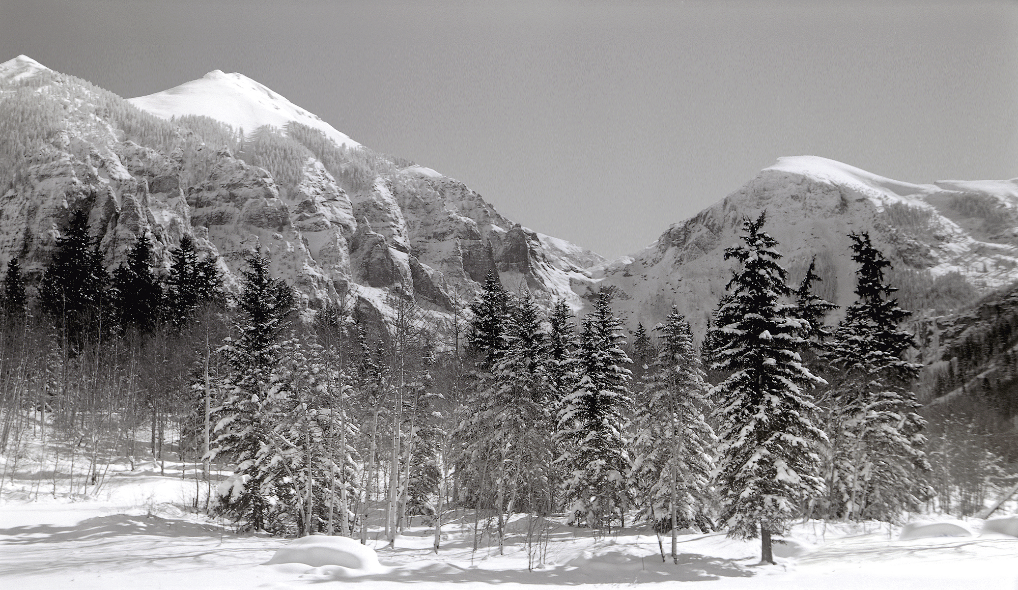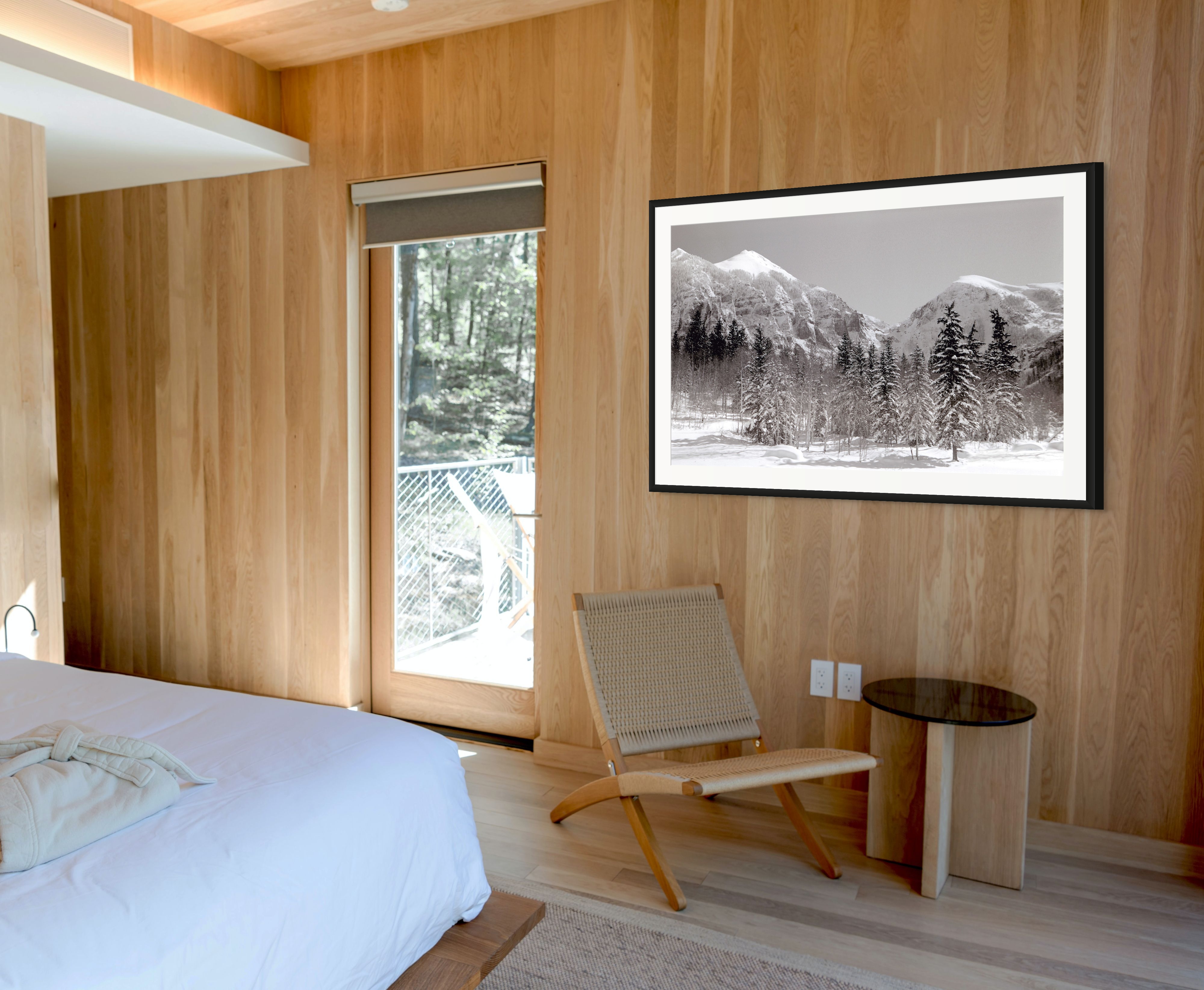 The image features a striking black and white photograph of a majestic, snow-covered mountainous landscape. Dominating the upper portion, the jagged peaks are beautifully blanketed in snow, highlighting the rugged textures and contours of the rocky surfaces. Nestled below, a dense cluster of evergreen trees stands tall and proud, their branches heavily laden with snow.