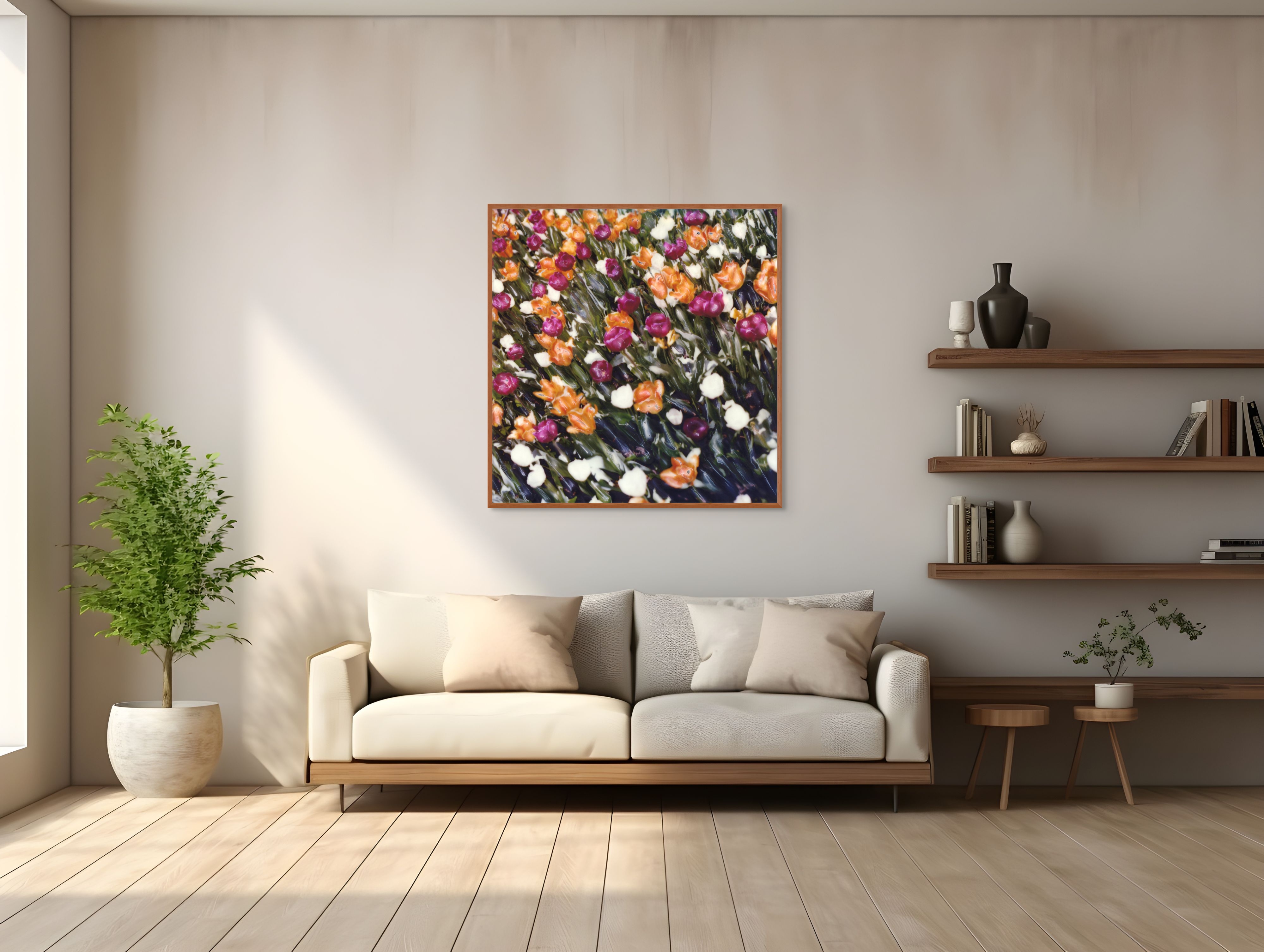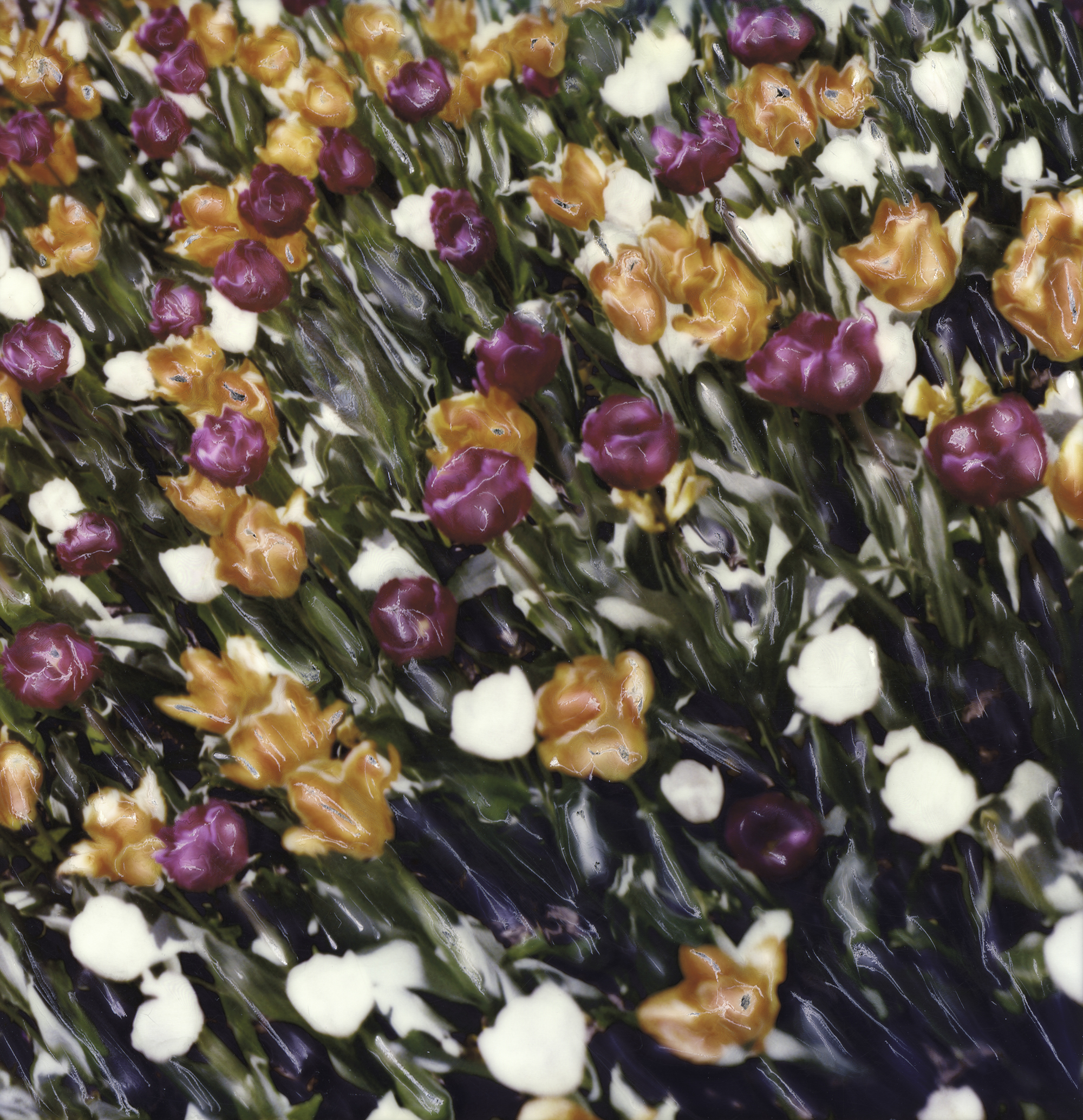 The artist has employed a unique method that creates a textured and fluid appearance, blending the colors in a way that suggests motion and energy. This gives the impression of viewing the tulips through a watery lens, enhancing the perception of depth and movement. The abstract nature invites viewers to engage with the image both as a representation of nature and an exploration of artistic expression.