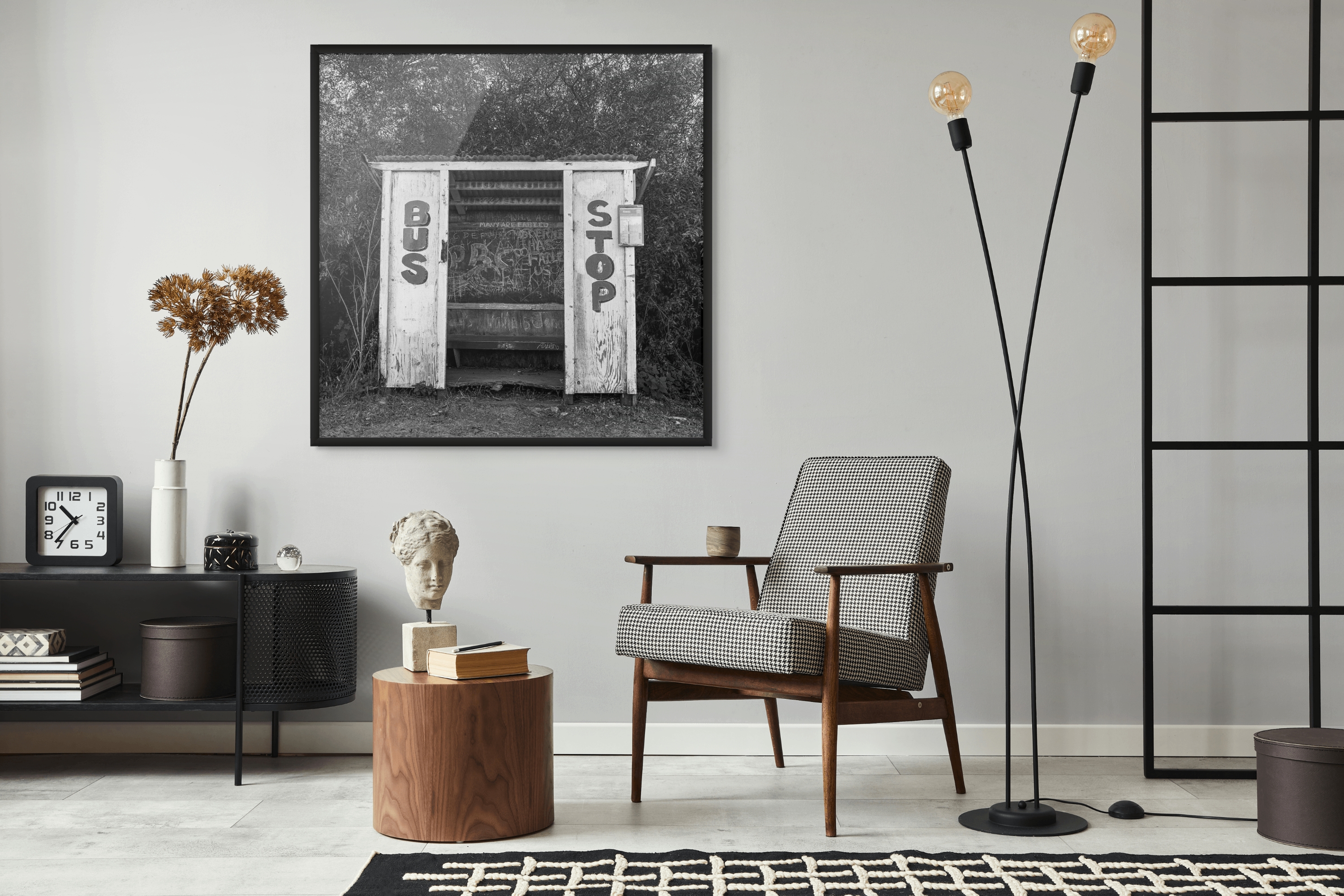 This evocative black and white photograph captures a rustic bus stop, imbued with a sense of nostalgia and abandonment. The image features a small wooden shelter with weathered, corrugated metal roofing, surrounded by lush foliage that hints at its rural setting.