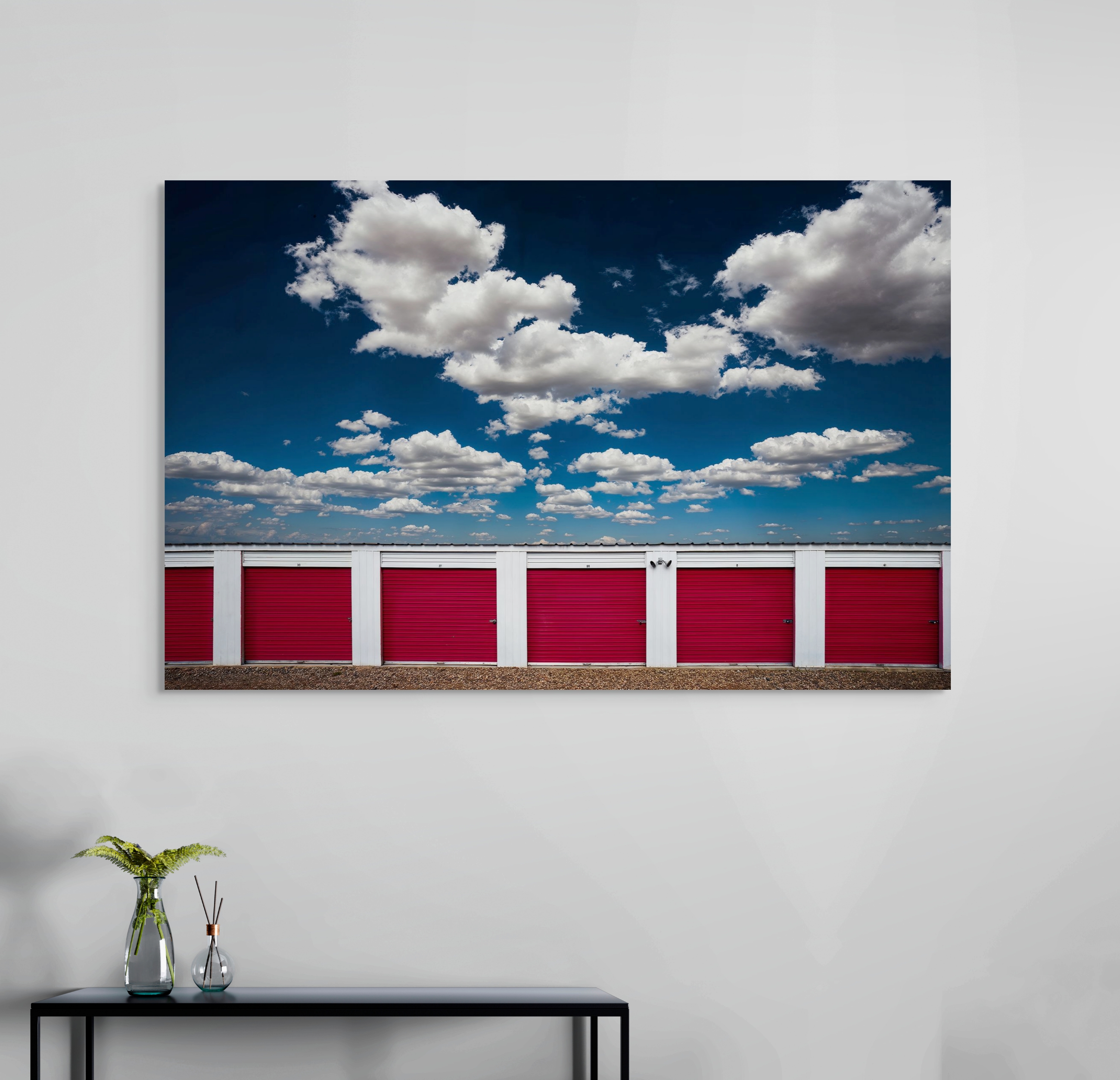 In striking contrast to the sky's organic fluidity, the lower portion of the image features a row of storage unit doors, brightly painted in a bold red. These doors, punctuated by vertical white dividers, introduce a rhythmic pattern, adding a layer of human-made regularity against the organic forms above. The coarse texture of the gravel in the foreground complements the industrial theme.
