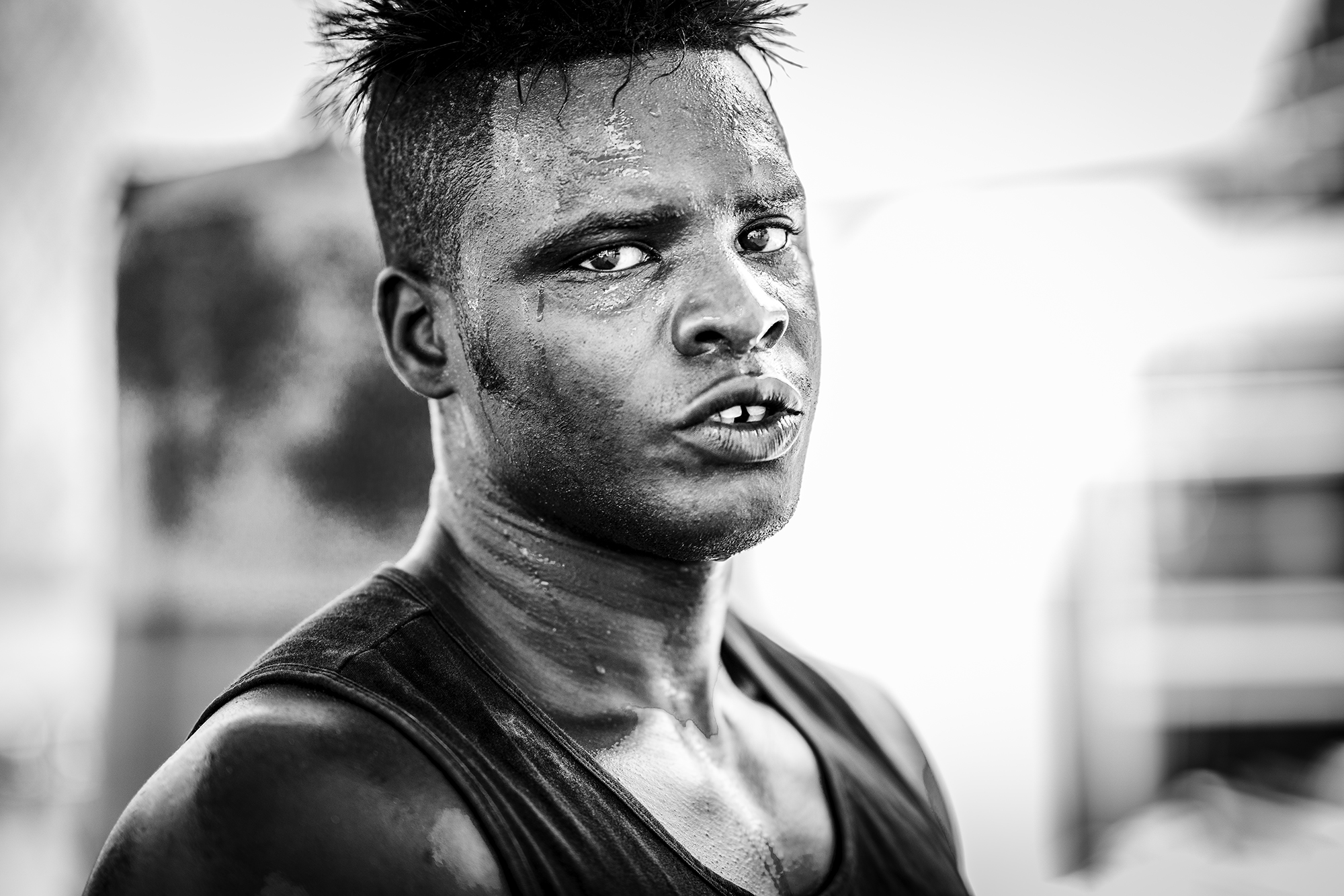 This striking black and white photograph captures the intense gaze of a young man, his face glistening with perspiration. The image is a compelling portrait, emphasizing raw emotion and the physicality of the subject. The man's direct eye contact with the viewer draws them into the frame, creating a powerful connection.