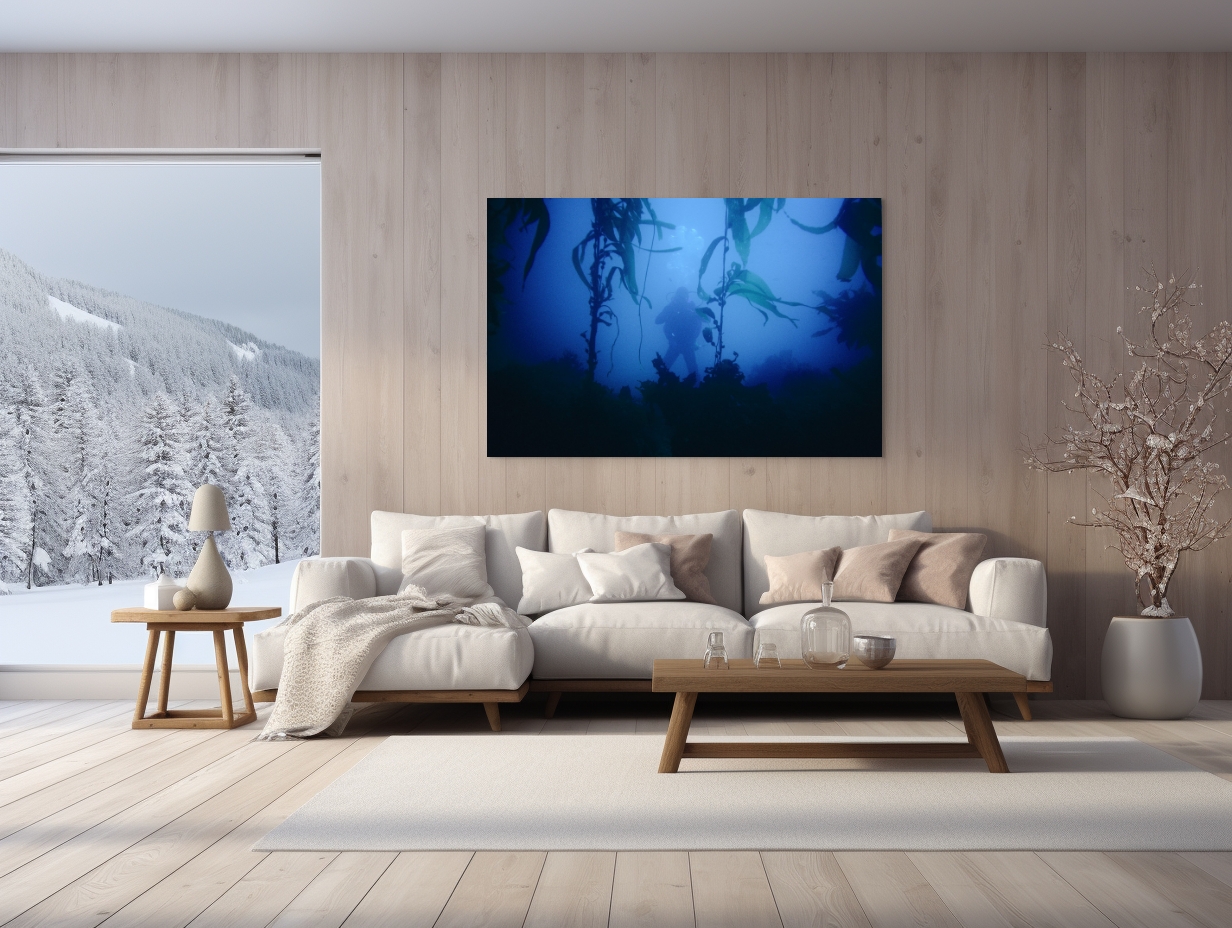 The image masterfully juxtaposes the organic textures of the kelp forest against the stark silhouette of the diver, highlighting a poignant intersection between nature and human exploration. The bubbles ascending from the diver’s breathing apparatus add a dynamic element to the stillness of the scene, hinting at movement and the fragile presence of life within this vast underwater realm.